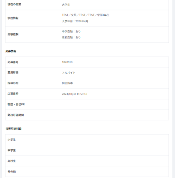 詳細な登録情報につきましては管理画面の「応募/採用確認管理」よりご確認ができます。