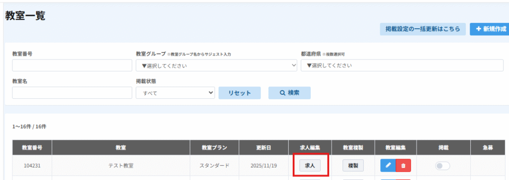 2.設定する求人が紐づいている教室の「求人」ボタンをクリック