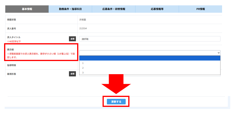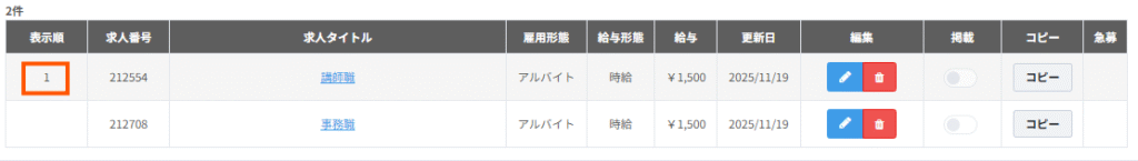 ※教室内で複数の求人が「1」と設定された場合、順位が適用されませんのでご注意ください。